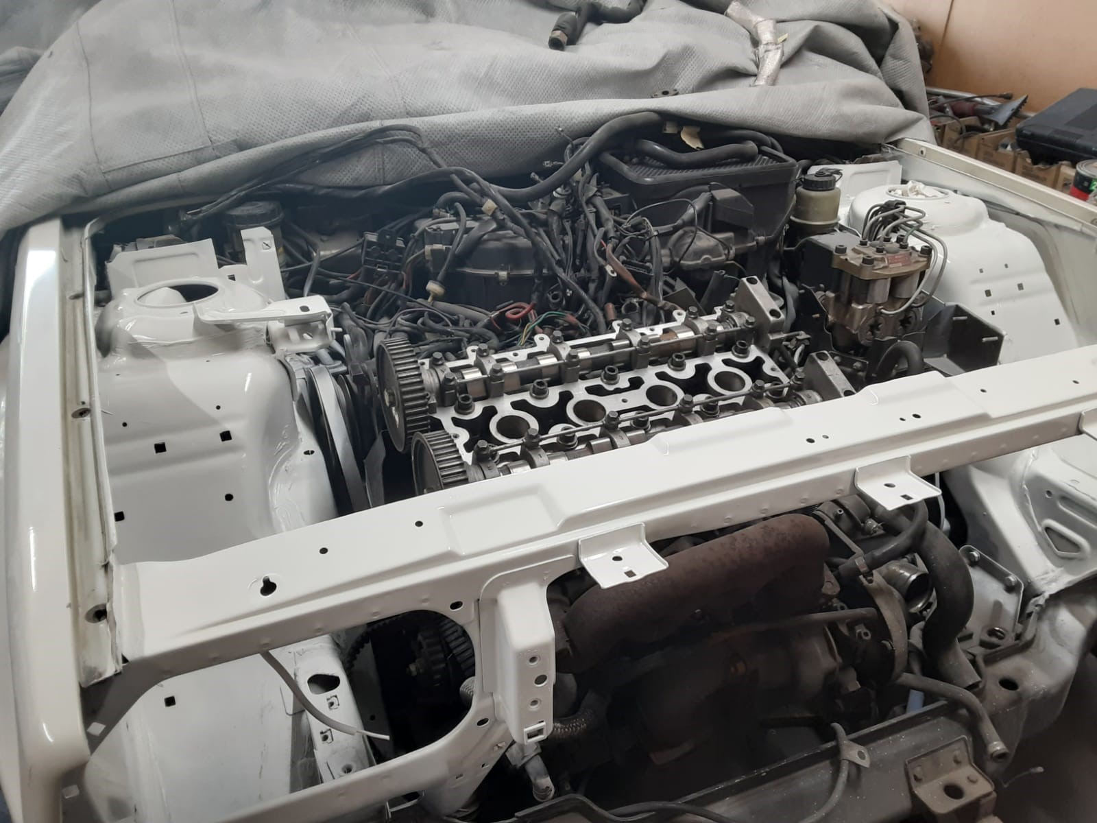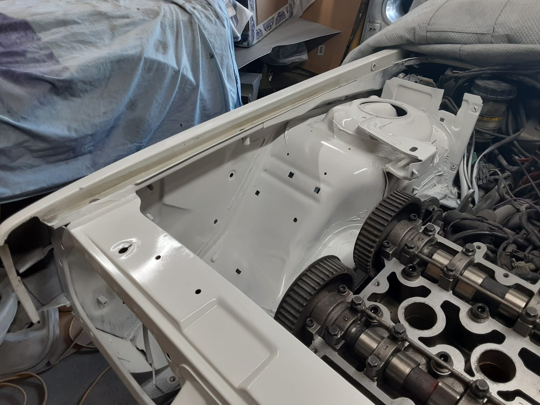 Under the hood it was a bit untidy so we stripped everything off the inner fenders, removed radiator and headlights and started to tidy up the engine compartment.